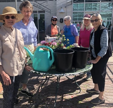 Annually, the Club spruces up the gardens and creates floral arrangements for Our Lady of Mercy Nursing Home residents in Guilderland on Community Service Day (photo above).